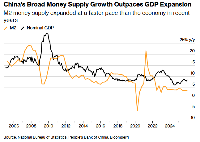 印钱速度超经济增长:中国M2与GDP增速对比