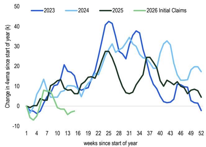 花旗研报指出,尽管近期初请失业金人数降至 20.7 万符合预期,但预计未来几周数据将回升。若重现春夏季走弱规律,二季度至三季度就业增长或降至零,导致夏末失业率突破 4.5%,投资者需警惕低招聘环境下劳动力市场的突然降温。