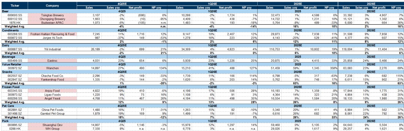 高盛看好中国必选消费 2026 年一季度加速增长,预计食品饮料板块普遍提速。万辰集团净利预增 127%,东鹏饮料预增 25%。报告重点推荐调味品、乳制品及价值零售商,认为茅台、海天、安井具备配置价值,而白酒除茅台外受政策影响复苏可能后置。