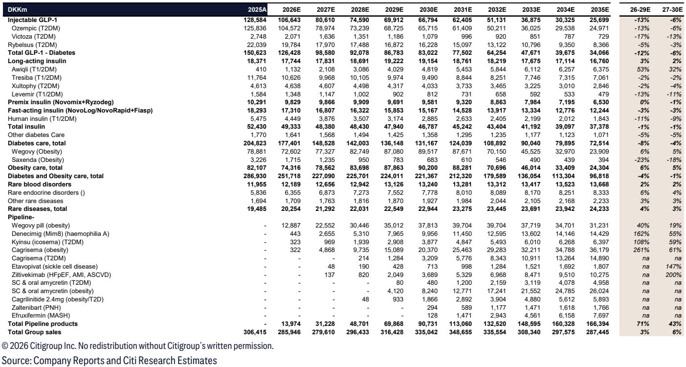 花旗下调诺和诺德目标价至 275 丹麦克朗并维持中性评级,核心原因是 Ozempic 处方量持续下滑及竞品数据冲击。尽管口服 Wegovy 首季贡献 2 亿美元,但长期面临定价与竞争不确定性,预计 2027-2031 年 EPS 预期将下调 3-7%。