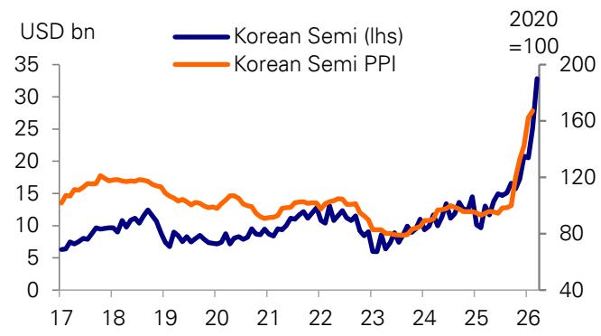 德意志银行上调韩国 2026 年 GDP 增速预期至 2.1%,主要受一季度出口激增 37.3% 及投资反弹驱动。报告看好韩元升值至 1400 及 KOSPI 指数表现,认为半导体强劲出口及国民年金公团增持国内股票将是关键催化剂,预计韩国央行将于四季度加息 25 个基点以应对下半年通胀回升。