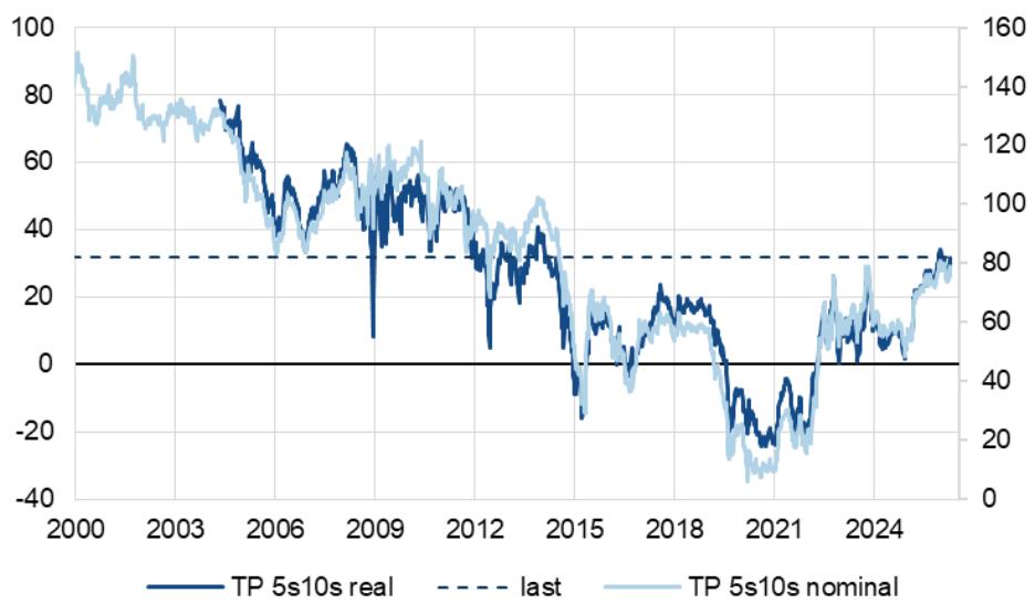 德银指出受地缘政治及欧元区战略自主需求推动,资本开支增加导致欧元实际期限溢价面临上行风险,目前已升至 2012-2013 年水平,中期或进一步走阔。